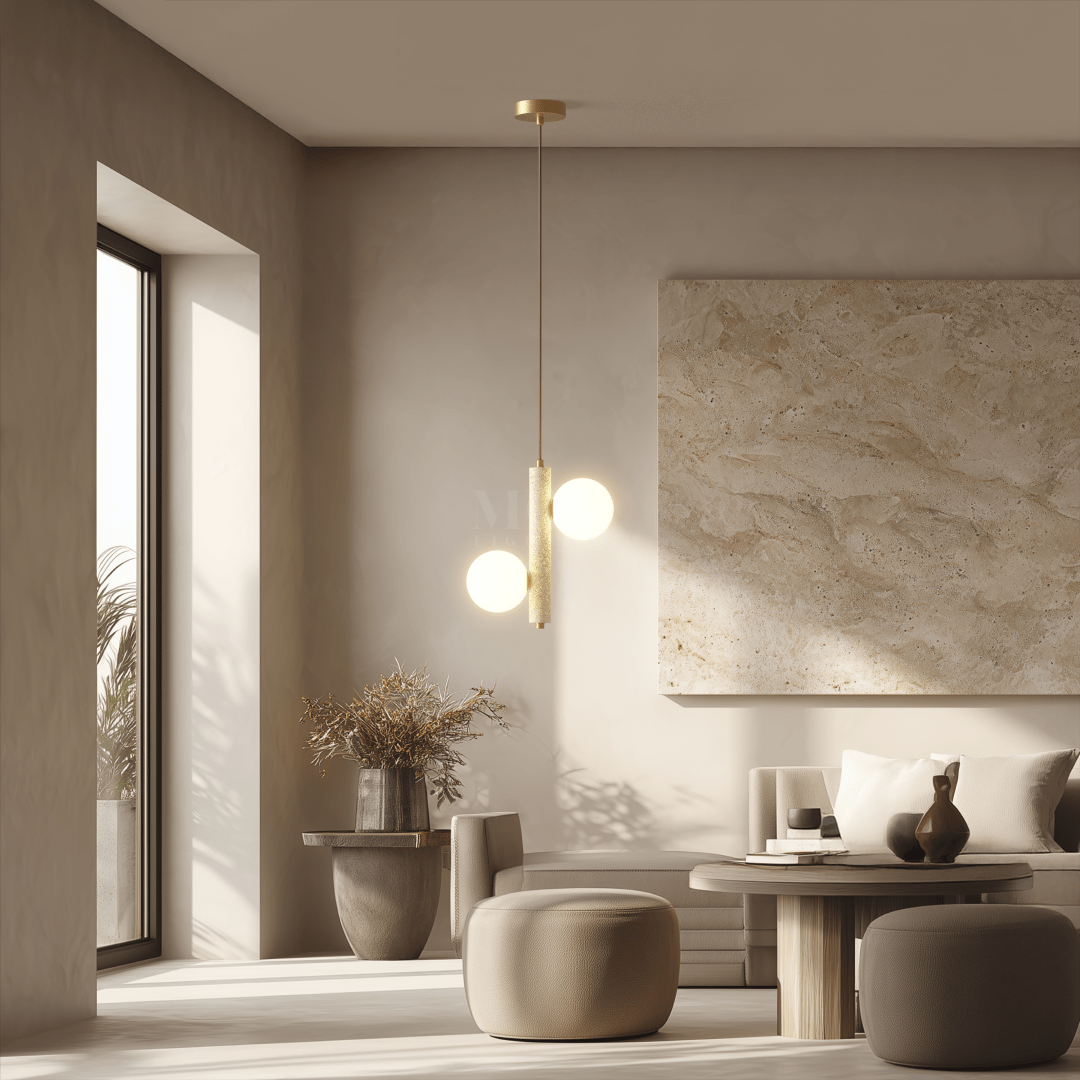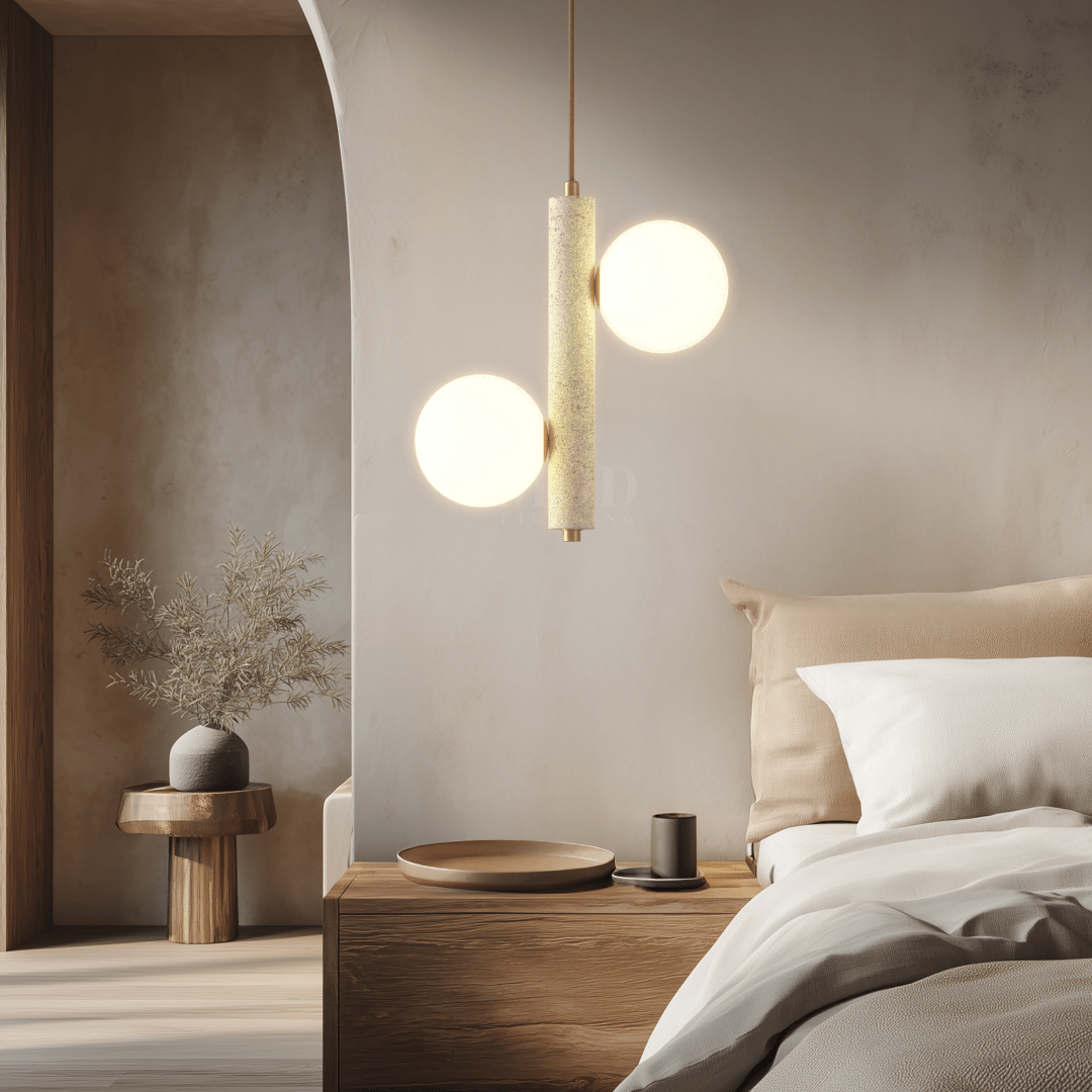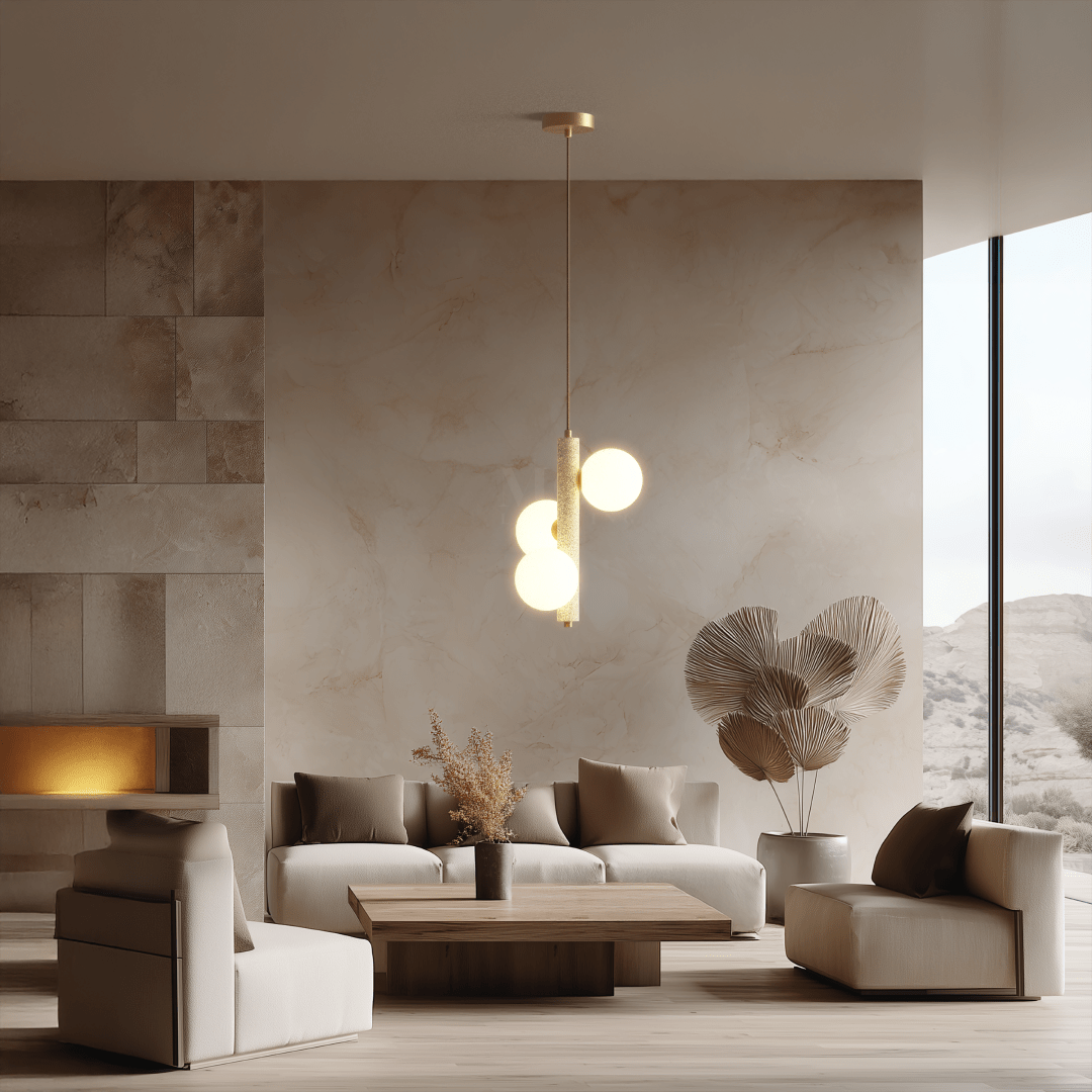 Crafted from yellow travertine stone, the Arabella Pendant brings modern warmth and sculptural impact to any space.