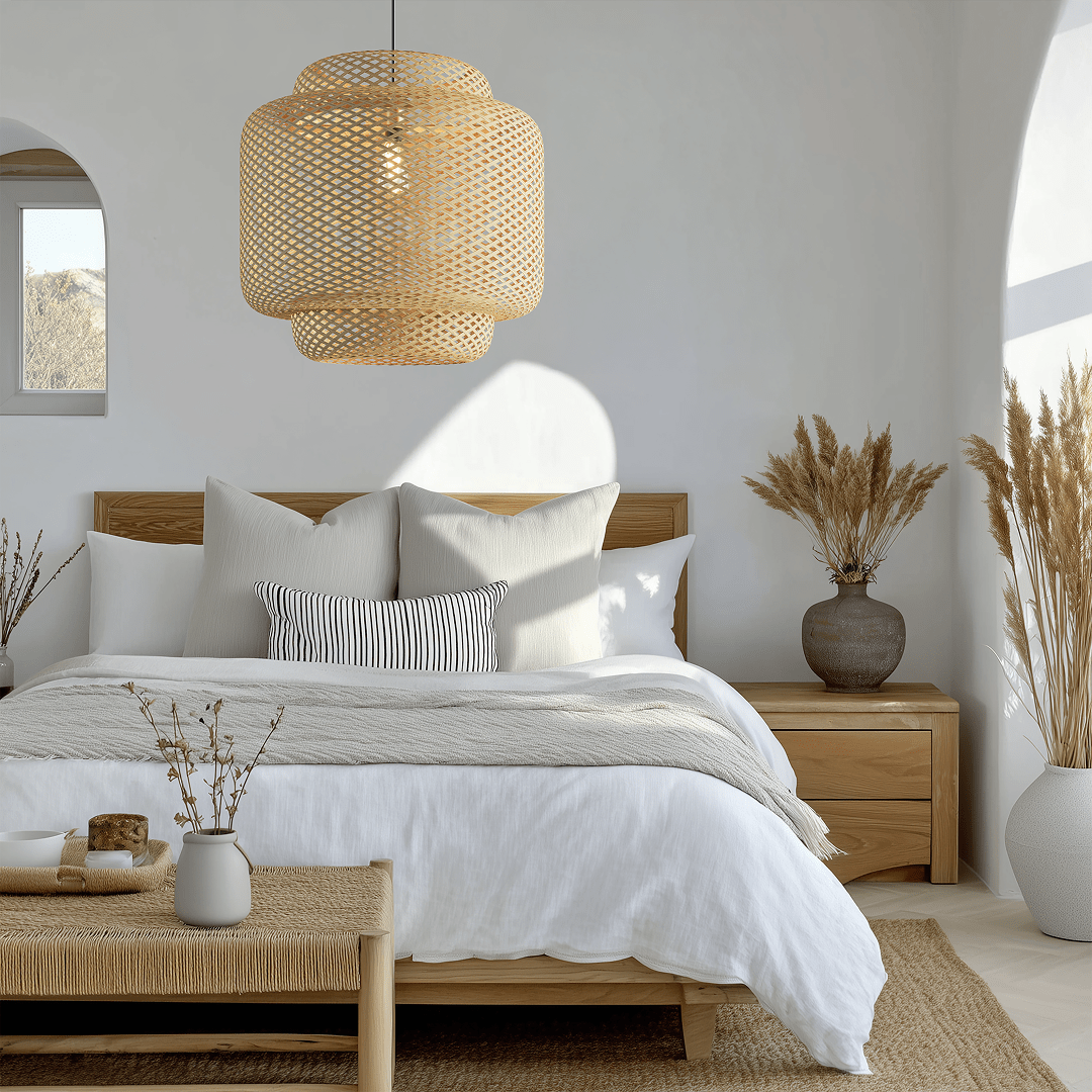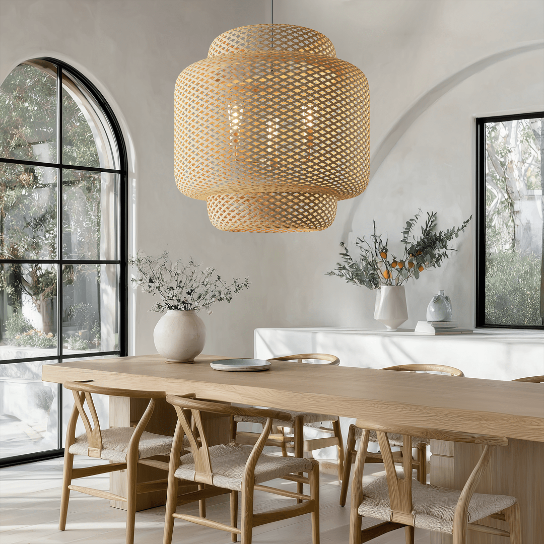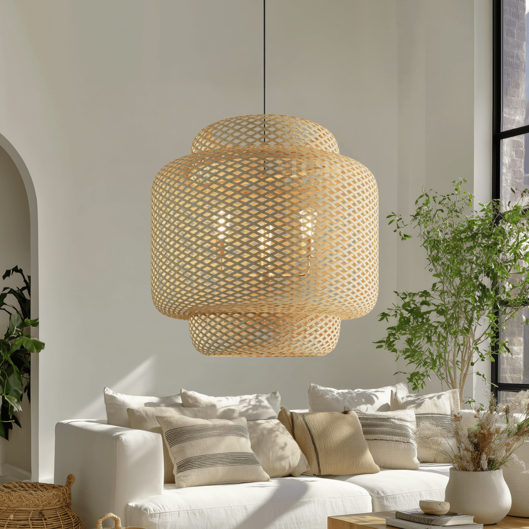 Hand-knit from natural bamboo with solid brass accents, Elva brings organic texture and modern ease to any space. Its layered form casts a warm, inviting glow with effortless boho character.